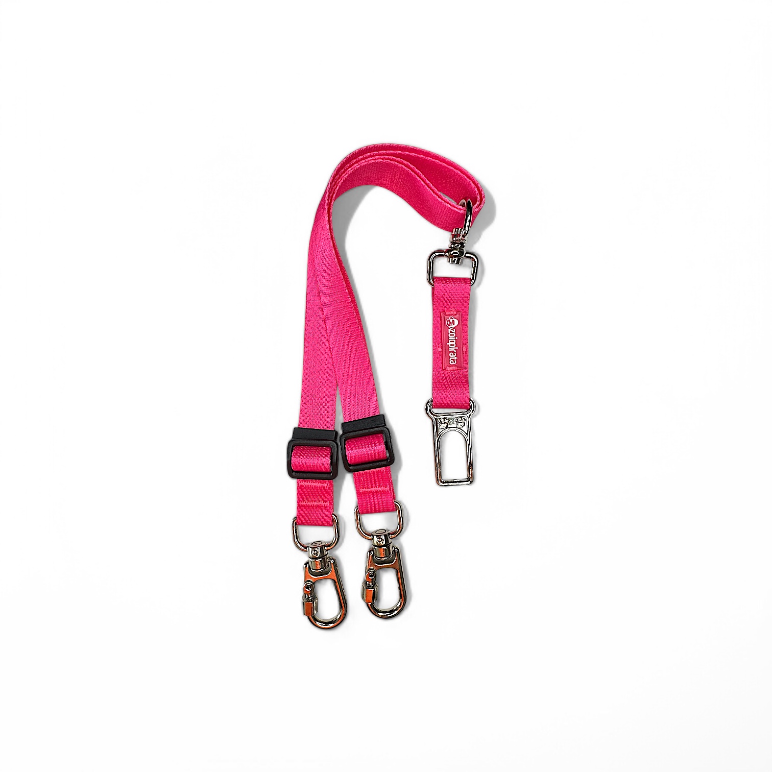Cinto de Segurança Duplo para transporte de dois cães com segurança e conformidade com o Código de Trânsito Brasileiro. Possui duas fitas ajustáveis independentes, oferecendo regulagem ideal para cada animal.